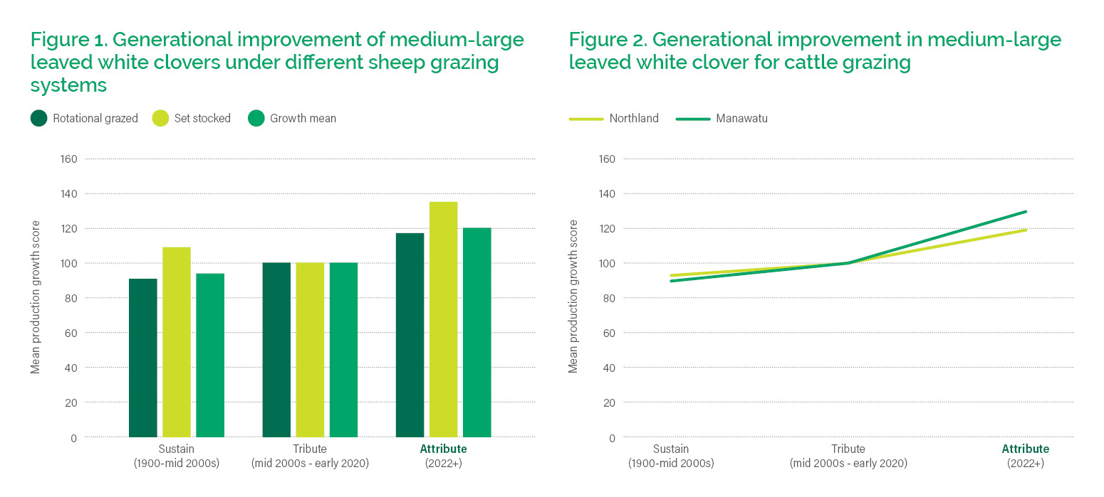 Attribute is a new medium to large-leaved white clover, representing the next step in genetic improvement within New Zealand’s most widely used clover category. It was developed from 12 elite breeding lines, specifically chosen for their persistence in year three of a multi-site breeder trial series. Importantly, these 12 lines were selected from a pool of 104 diverse elite entries drawn from multiple breeding programmes. The timing of Attribute’s development, coinciding with the merging of several breeding programmes, means its parentage represents a unique and highly valuable generation.