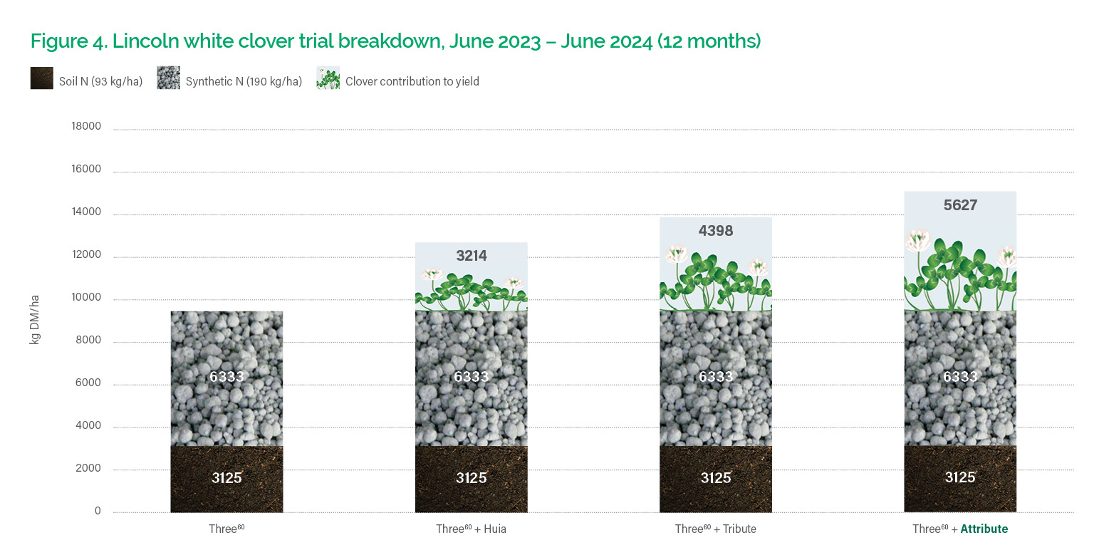Figure 4 presents 12 months of yield data in the trial. With the same amount of nitrogen applied, Three60 + Attribute produced an additional 2413 kg DM/ha compared to Three60 + Huia highlighting the significant annual production gains achievable with modern white clover genetics.